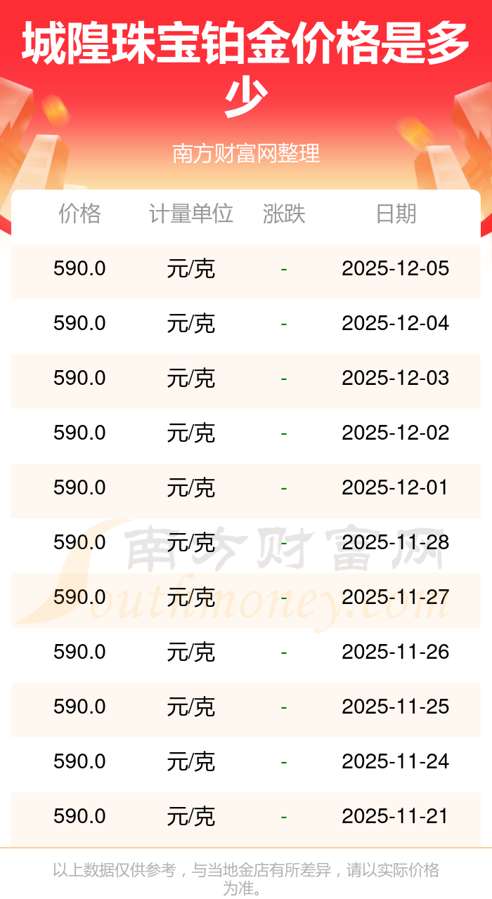目前城隍珠宝 铂金价格的价格,今日最新为590.0元/克。