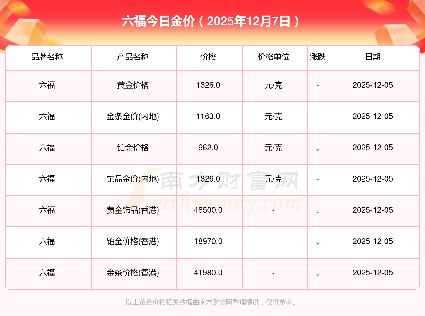 2025年12月7日六福金价查询:黄金价格1328.0元/克,铂金价格662.0元/克,饰品金价(内地)1328.0元/克,黄金饰品(香港)46550.0,铂金价格(香港)18970.0,金条价格(香港)41990.0,金条金价(内地)1165.0元/克,黄金价格1325.0元/克,铂金价格600.0元/克,足金价格1325.0元/克,黄金价格1289.0元/克。