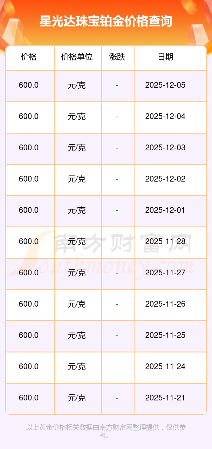 今日星光达珠宝铂金价格最新价格为600.0元/克。