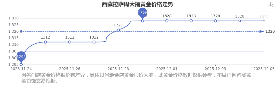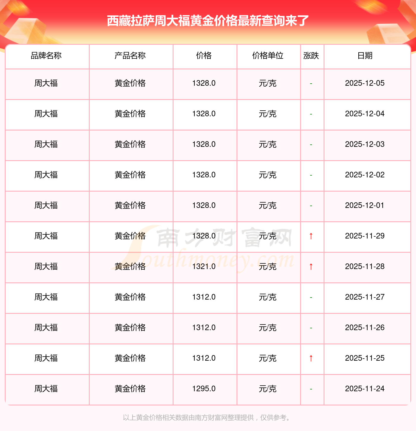 2025年12月7日西藏拉萨周大福黄金价格为1328.0元/克。