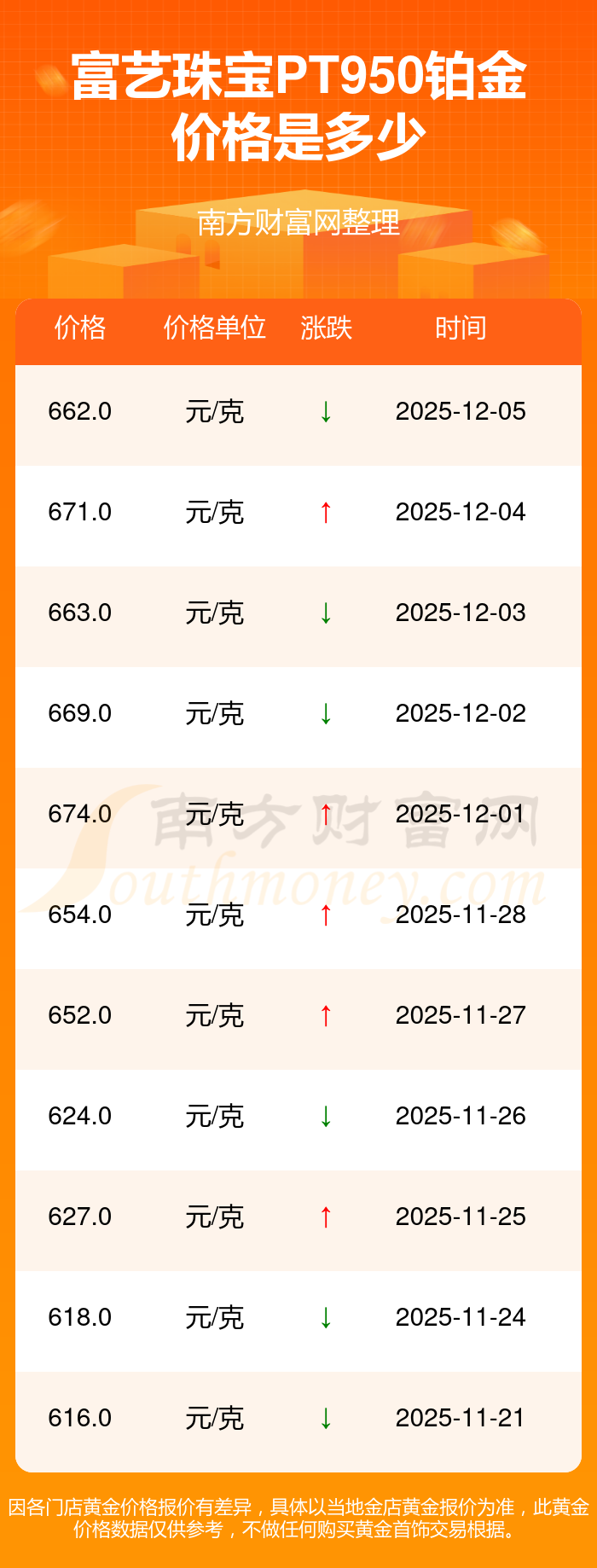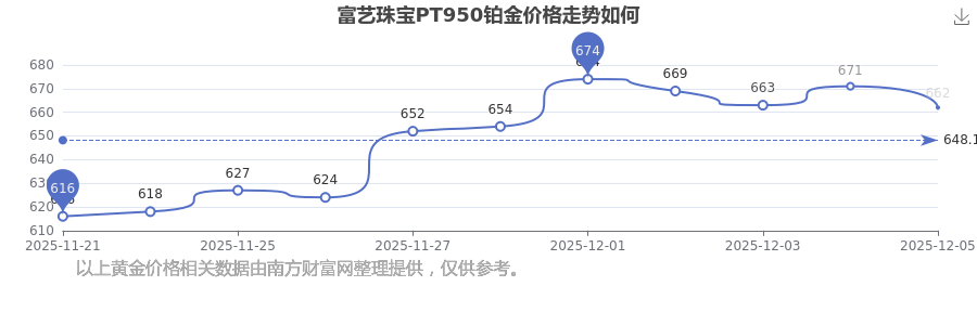 今日(2025年12月7日)富艺珠宝PT950铂金的价格为662.0元/克。