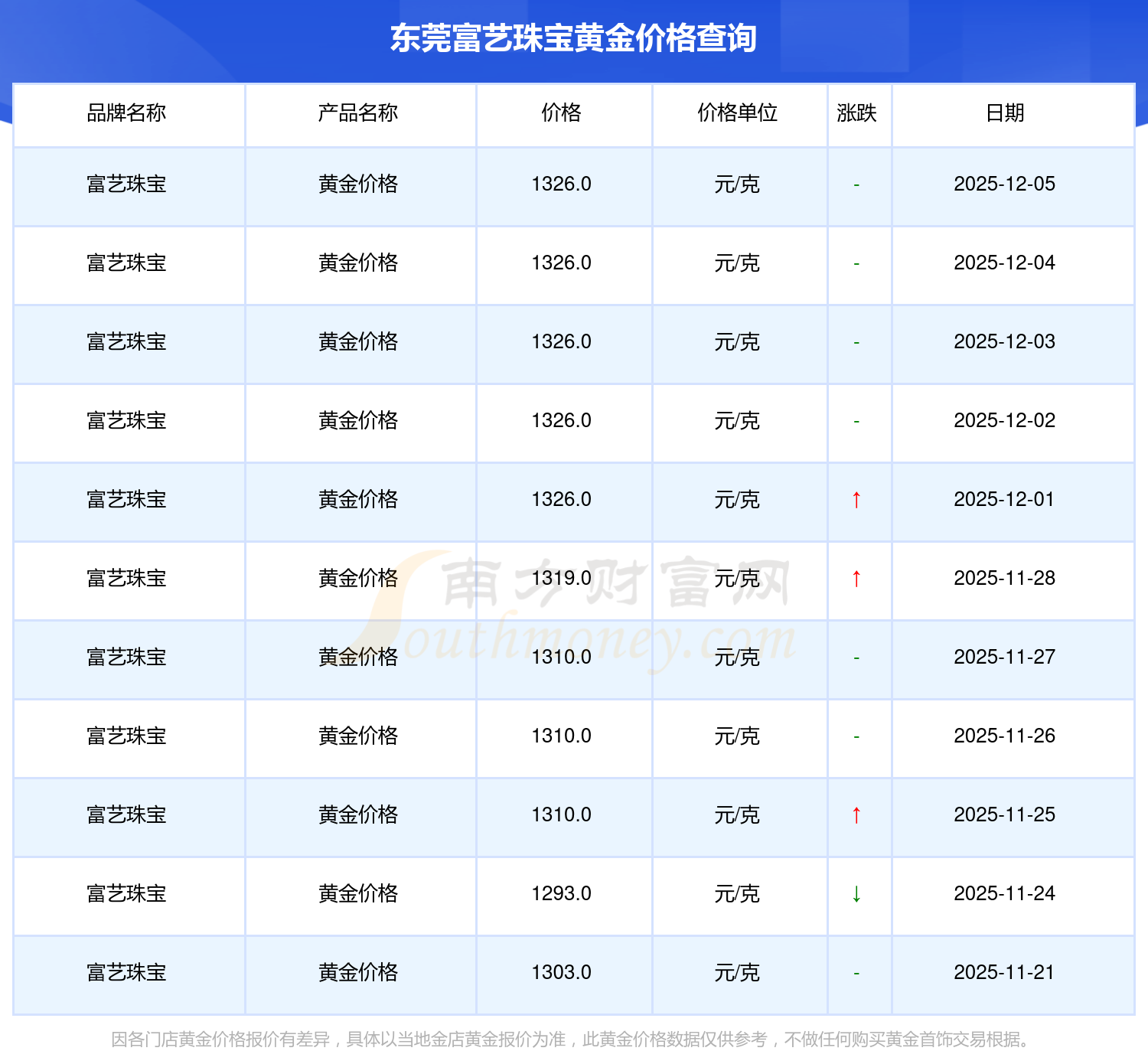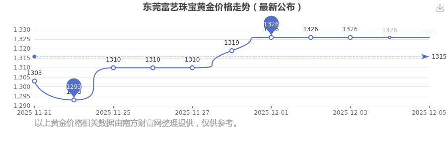 今日东莞富艺珠宝黄金价格为1326.0元/克。