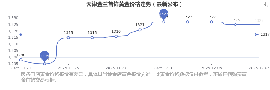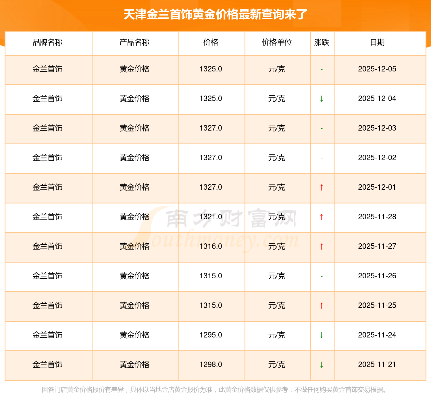 今日(2025年12月7日),天津金兰首饰黄金价格的价格是1325.0元/克。
