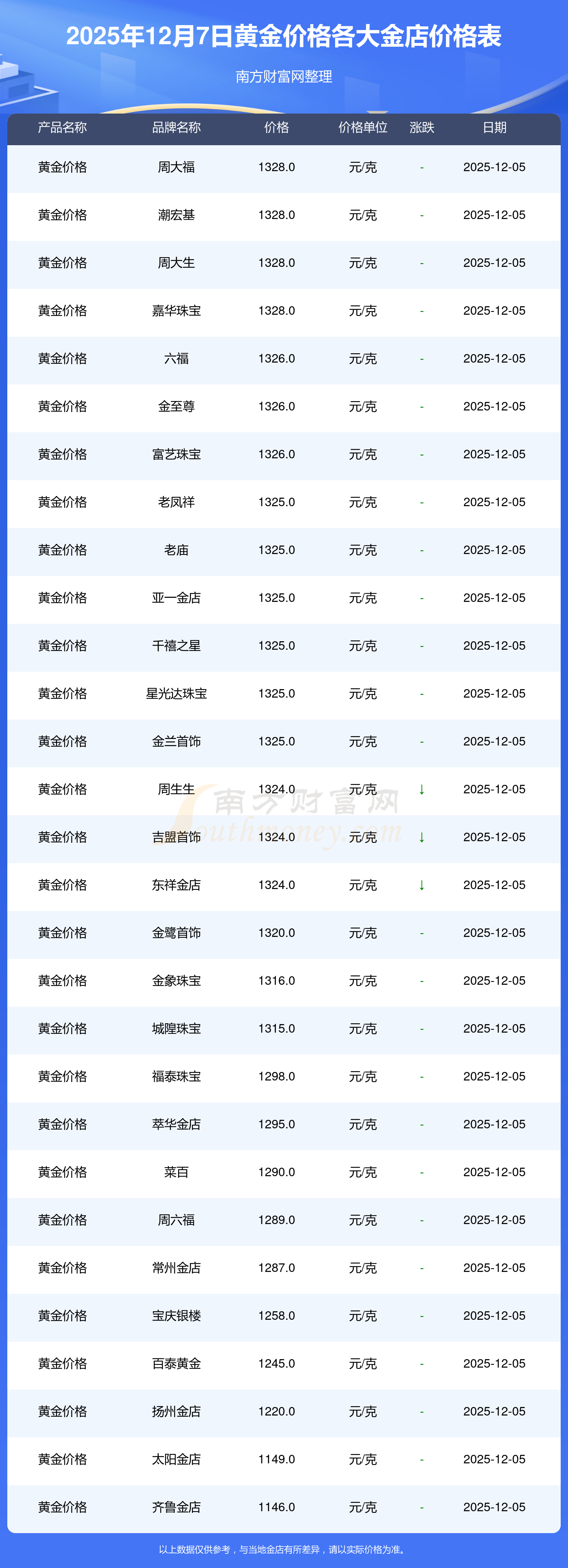 2025年12月7日各大金店黄金价格最新价格:周大福1328.0元/克,周大福662.0元/克,周大福1328.0元/克,周大福46550.0,周大福18970.0,周大福41990.0,周大福1165.0元/克,老凤祥1325.0元/克,老凤祥600.0元/克,老凤祥1325.0元/克,周六福1289.0元/克。