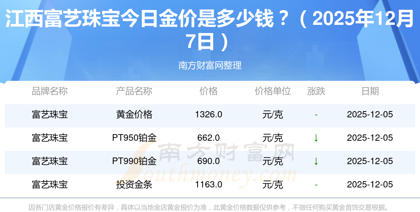 今天黄金价格几何?现在每克黄金值多少钱?2025年12月7日江西富艺珠宝现在购买一克黄金需要支付多少钱?黄金价格1328.0元/克,铂金价格662.0元/克,饰品金价(内地)1328.0元/克,黄金饰品(香港)46550.0,铂金价格(香港)18970.0,金条价格(香港)41990.0,金条金价(内地)1165.0元/克,黄金价格1325.0元/克,铂金价格600.0元/克,足金价格1325.0元/克,黄金价格1289.0元/克。