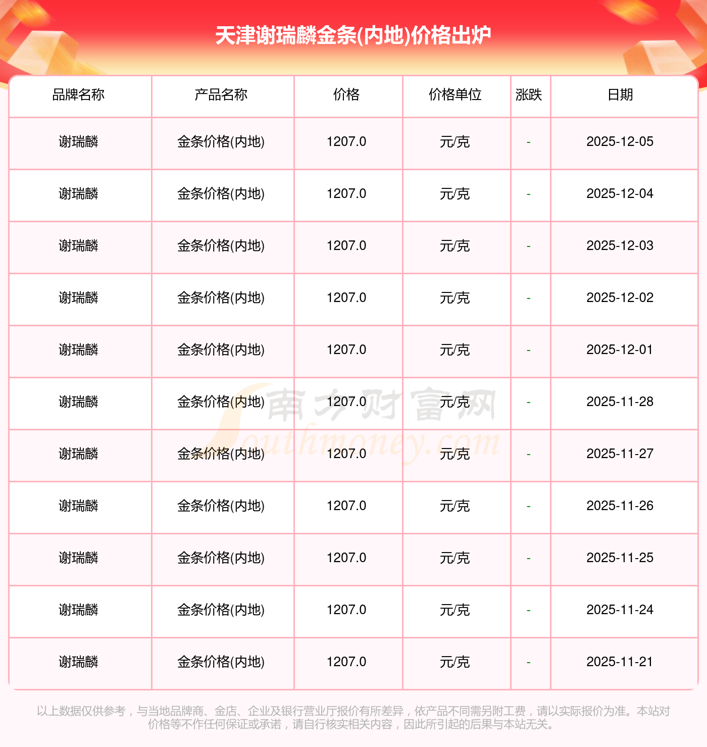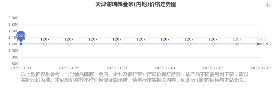 2025年12月7日,天津谢瑞麟金条价格(内地)每克的售卖价位为1207.0元/克。