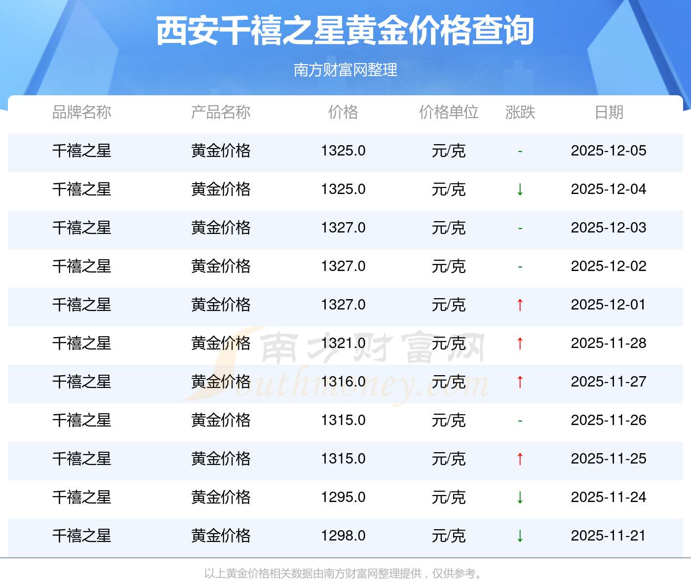 2025年12月7日西安千禧之星黄金价格:1325.0元/克。