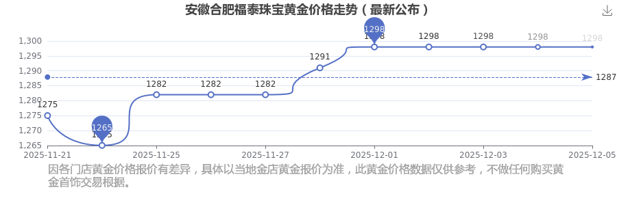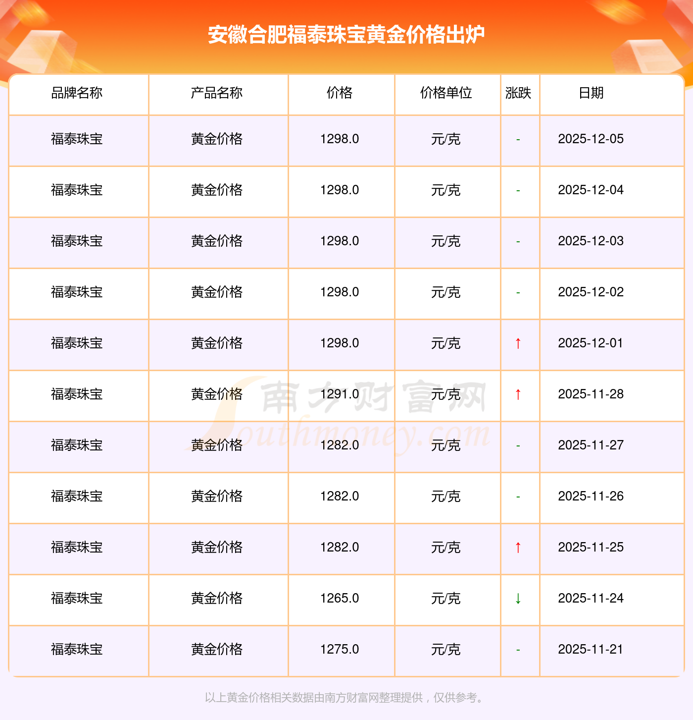 2025年12月7日,安徽合肥福泰珠宝的黄金价格标价达到 1298.0元/克。
