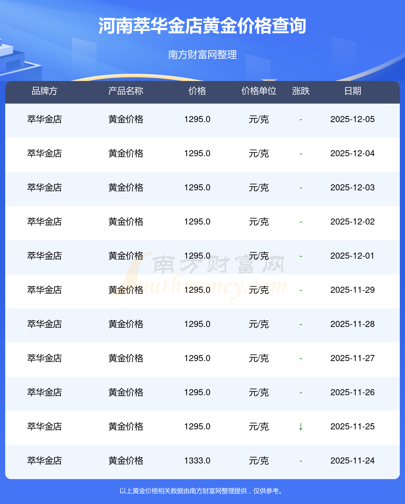2025年12月7日,河南萃华金店黄金价格每克的售卖价位为1295.0元/克。