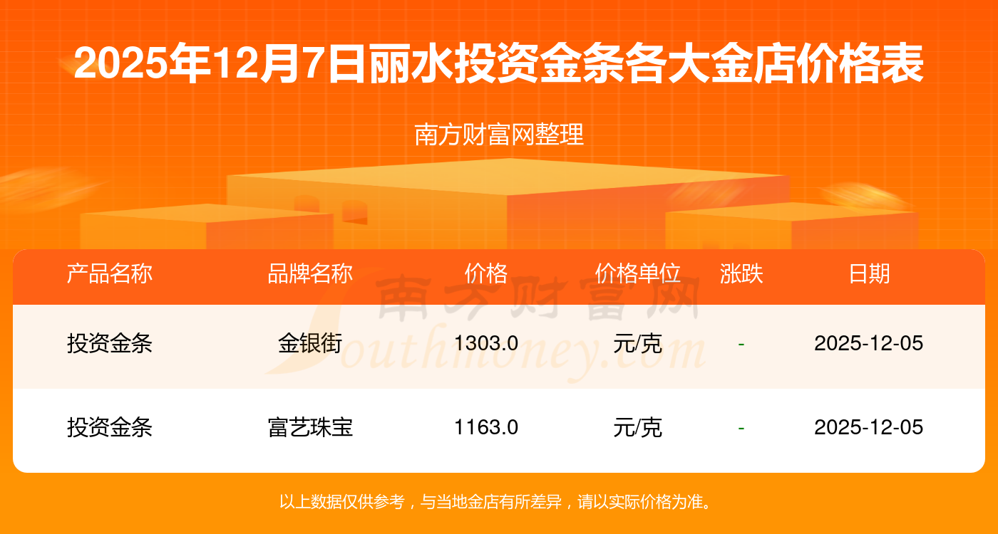 2025年12月7日丽水各大金店投资金条最新价格:周大福1328.0元/克,周大福662.0元/克,周大福1328.0元/克,周大福46550.0,周大福18970.0,周大福41990.0,周大福1165.0元/克,老凤祥1325.0元/克,老凤祥600.0元/克,老凤祥1325.0元/克,周六福1289.0元/克。