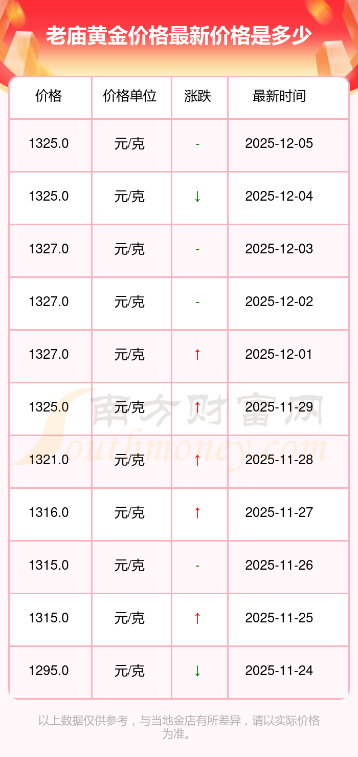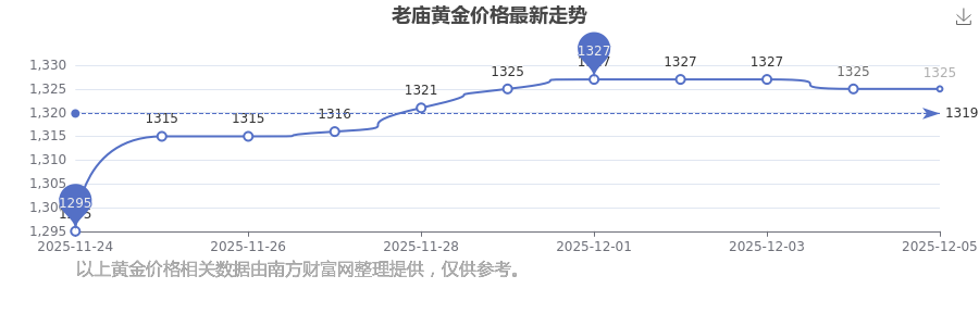 今日(2025年12月7日),老庙黄金价格最新价格为1325.0元/克。