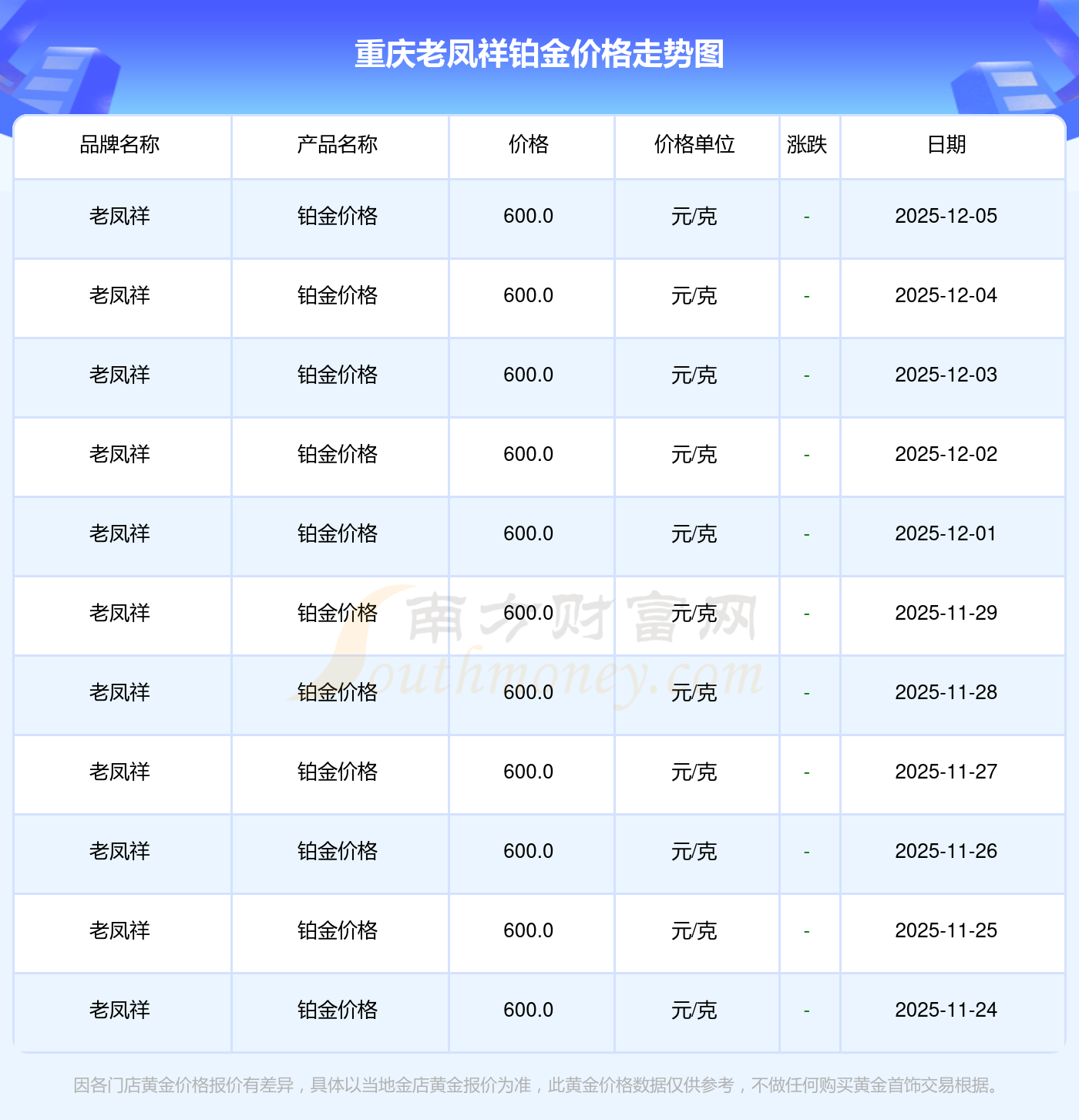 今日重庆老凤祥铂金价格为600.0元/克。