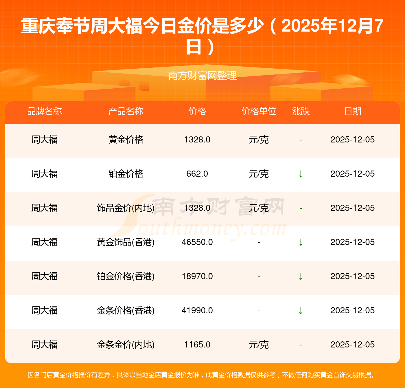 2025年12月7日周大福金条多少钱1克 现在重庆奉节周大福黄金价格查询