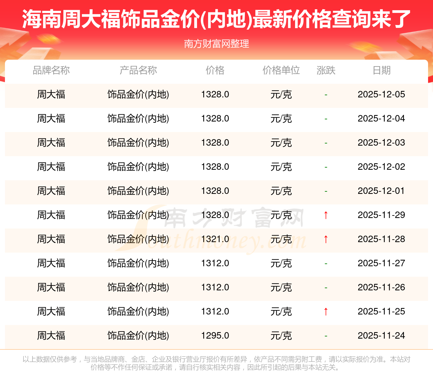 2025年12月7日各大金店饰品金价(内地)最新价格:周大福1328.0元/克,周大福662.0元/克,周大福1328.0元/克,周大福46550.0,周大福18970.0,周大福41990.0,周大福1165.0元/克,老凤祥1325.0元/克,老凤祥600.0元/克,老凤祥1325.0元/克,周六福1289.0元/克。