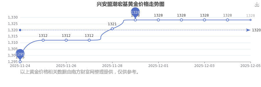 2025年12月7日,今日兴安盟潮宏基黄金价格:1328.0元/克。