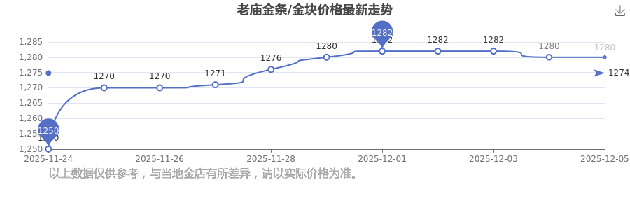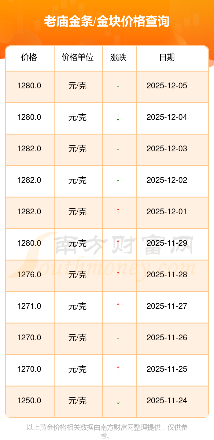 老庙 金条/金块价格于今日的最新挂牌价为1280.0元/克。