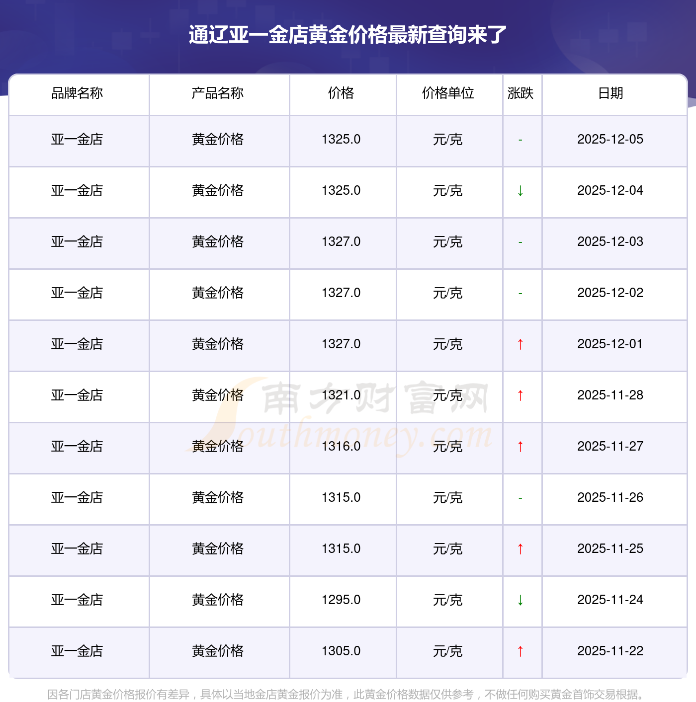 1325.0元/克,这是通辽亚一金店于 2025年12月7日所定的黄金价格。