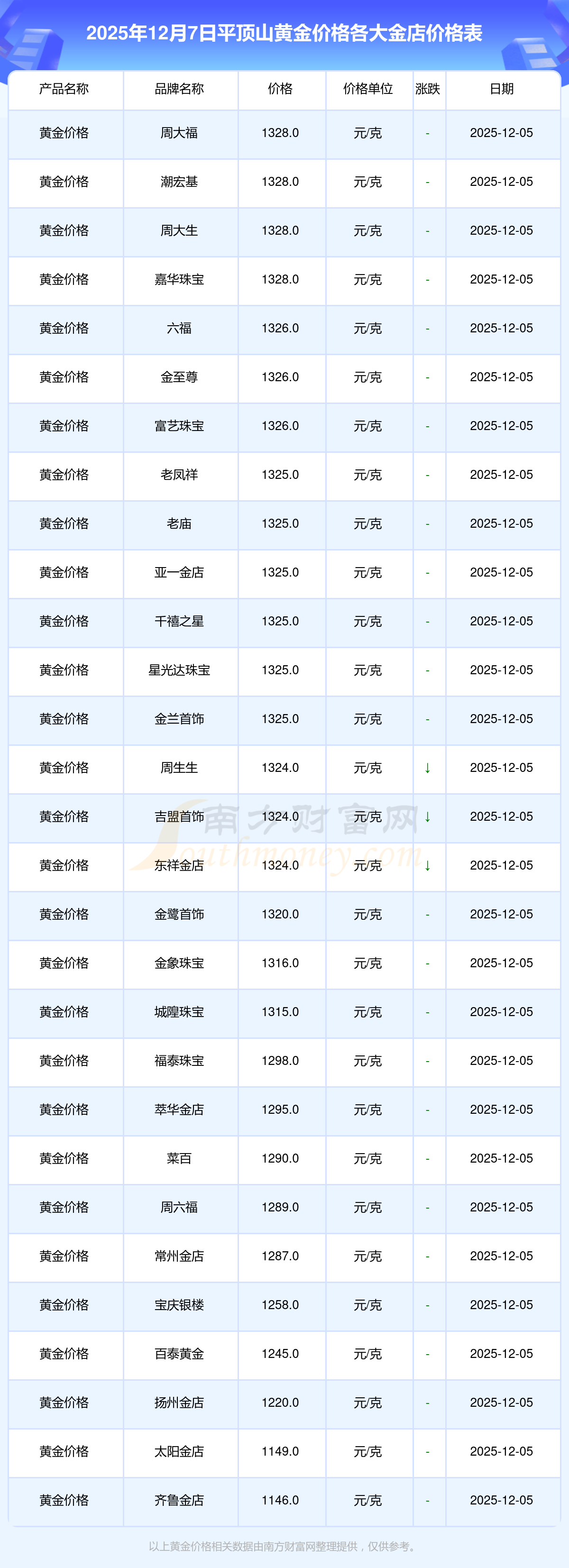 2025年12月7日平顶山各大金店黄金价格最新价格:周大福1328.0元/克,周大福662.0元/克,周大福1328.0元/克,周大福46550.0,周大福18970.0,周大福41990.0,周大福1165.0元/克,老凤祥1325.0元/克,老凤祥600.0元/克,老凤祥1325.0元/克,周六福1289.0元/克。