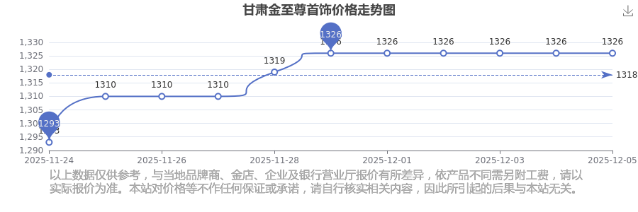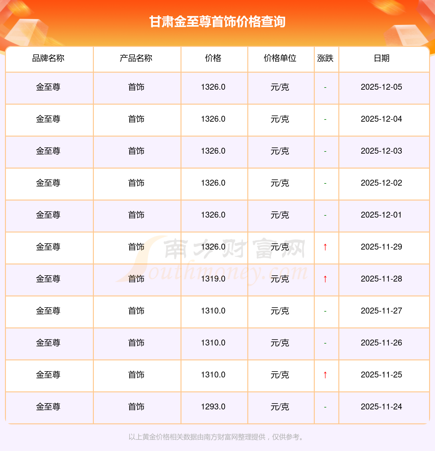 甘肃金至尊 2025年12月7日的首饰价位为 1326.0元/克。