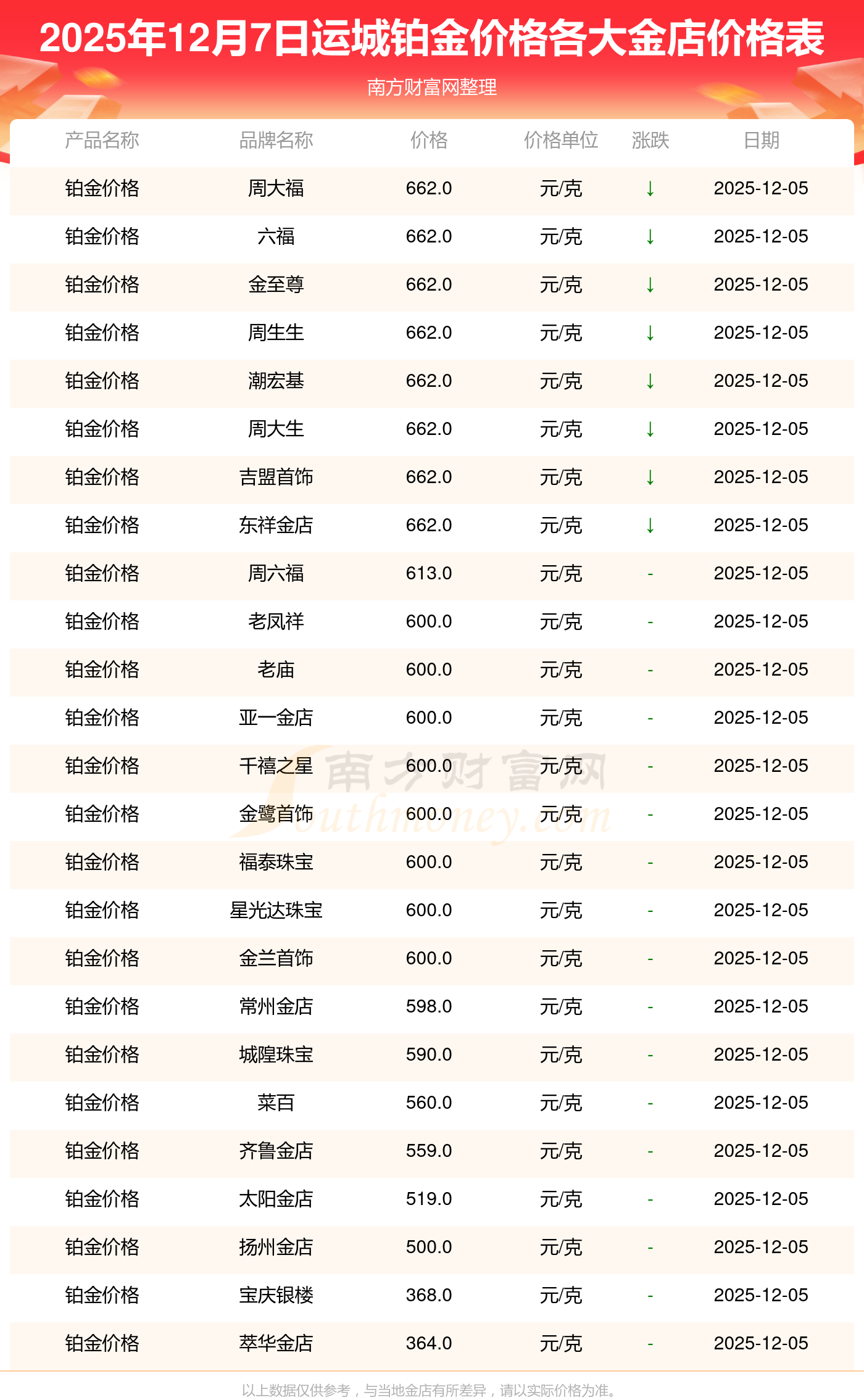 2025年12月7日运城周大福、周大福、周大福、周大福、周大福、周大福、周大福、老凤祥、老凤祥、老凤祥、周六福等各大金店品牌铂金价格最新价格如下:周大福黄金价格1328.0元/克,周大福铂金价格662.0元/克,周大福饰品金价(内地)1328.0元/克,周大福黄金饰品(香港)46550.0,周大福铂金价格(香港)18970.0,周大福金条价格(香港)41990.0,周大福金条金价(内地)1165.0元/克,老凤祥黄金价格1325.0元/克,老凤祥铂金价格600.0元/克,老凤祥足金价格1325.0元/克,周六福黄金价格1289.0元/克。