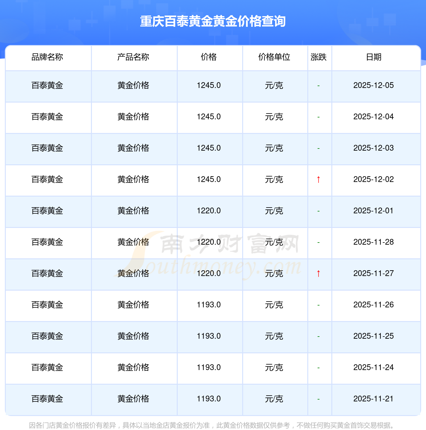 (2025年12月7日)今日重庆百泰黄金黄金价格是1245.0元/克。