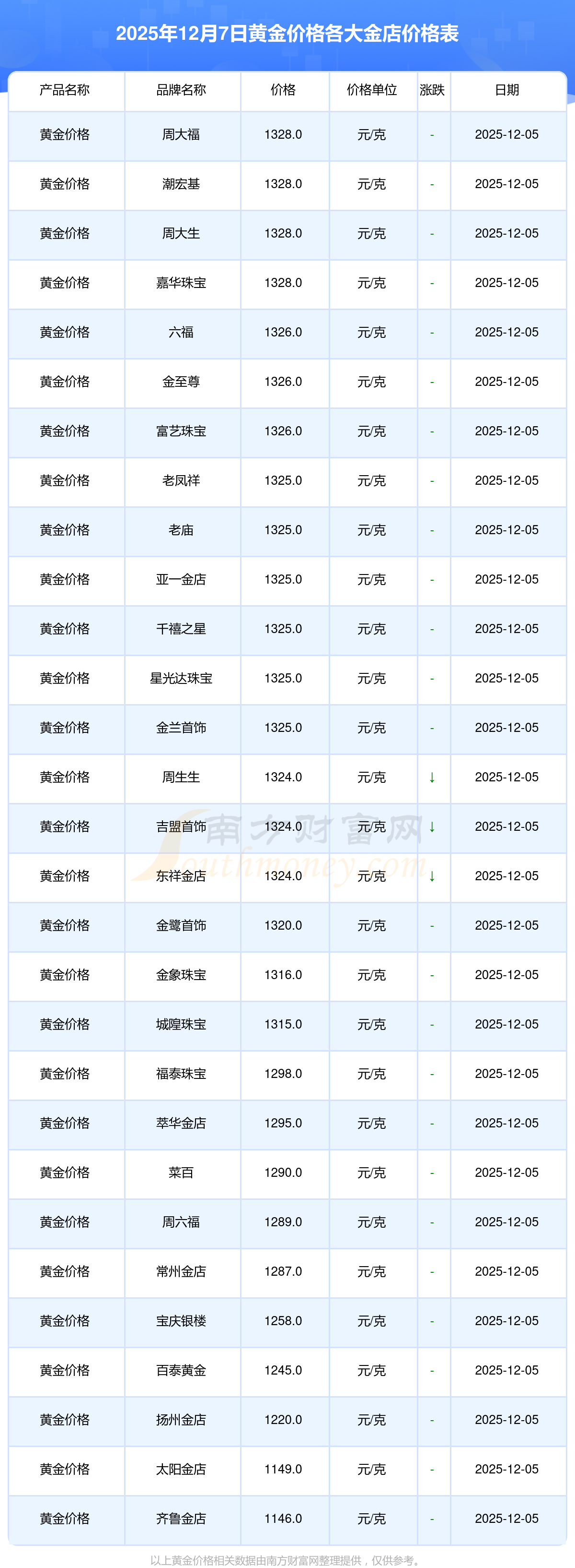 2025年12月7日各大金店黄金价格最新价格:周大福1328.0元/克,周大福662.0元/克,周大福1328.0元/克,周大福46550.0,周大福18970.0,周大福41990.0,周大福1165.0元/克,老凤祥1325.0元/克,老凤祥600.0元/克,老凤祥1325.0元/克,周六福1289.0元/克。