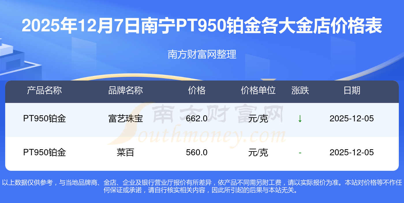 2025年12月7日南宁各大金店PT950铂金最新价格查询来了:周大福1328.0元/克,周大福662.0元/克,周大福1328.0元/克,周大福46550.0,周大福18970.0,周大福41990.0,周大福1165.0元/克,老凤祥1325.0元/克,老凤祥600.0元/克,老凤祥1325.0元/克,周六福1289.0元/克。