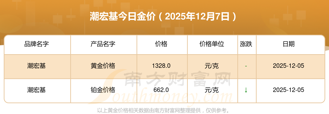2025年12月7日潮宏基金价查询:黄金价格1328.0元/克,铂金价格662.0元/克,饰品金价(内地)1328.0元/克,黄金饰品(香港)46550.0,铂金价格(香港)18970.0,金条价格(香港)41990.0,金条金价(内地)1165.0元/克,黄金价格1325.0元/克,铂金价格600.0元/克,足金价格1325.0元/克,黄金价格1289.0元/克。
