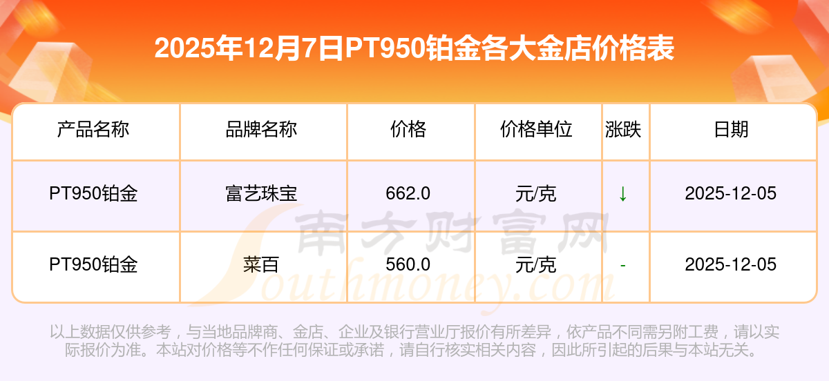 2025年12月7日,周大福、周大福、周大福、周大福、周大福、周大福、周大福、老凤祥、老凤祥、老凤祥、周六福等各大金店品牌PT950铂金今日价格如下:周大福1328.0元/克、周大福662.0元/克、周大福1328.0元/克、周大福46550.0、周大福18970.0、周大福41990.0、周大福1165.0元/克、老凤祥1325.0元/克、老凤祥600.0元/克、老凤祥1325.0元/克、周六福1289.0元/克。