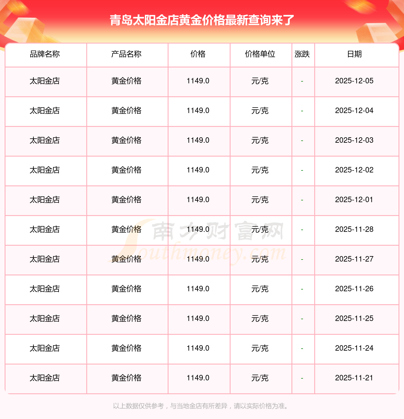 2025年12月7日,青岛太阳金店的黄金价格标价达到 1149.0元/克。