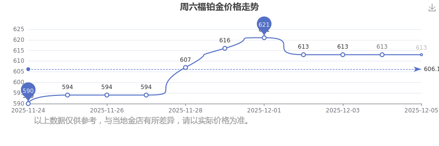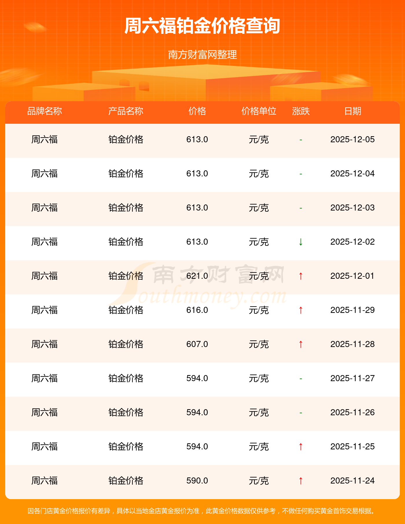 今日周六福所公布的 铂金价格最新价格为613.0元/克。