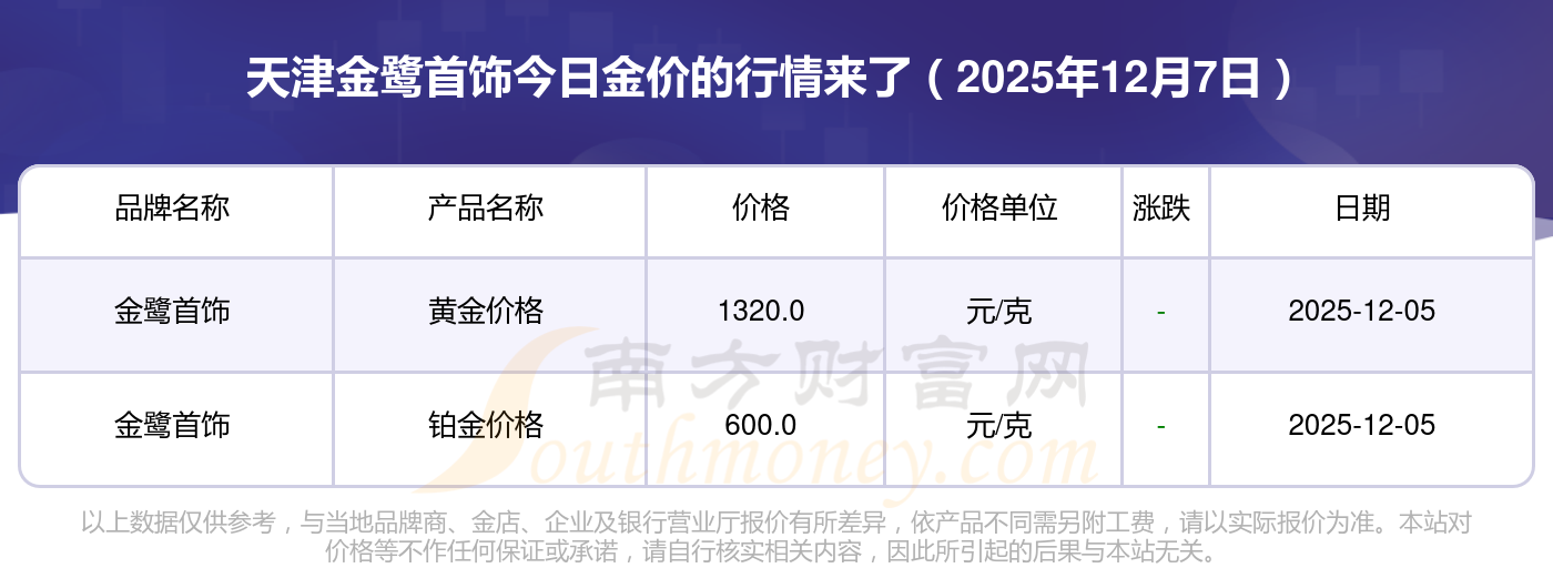 2025年12月7日天津金鹭首饰现在黄金一克要多少钱:黄金价格1328.0元/克,铂金价格662.0元/克,饰品金价(内地)1328.0元/克,黄金饰品(香港)46550.0,铂金价格(香港)18970.0,金条价格(香港)41990.0,金条金价(内地)1165.0元/克,黄金价格1325.0元/克,铂金价格600.0元/克,足金价格1325.0元/克,黄金价格1289.0元/克。