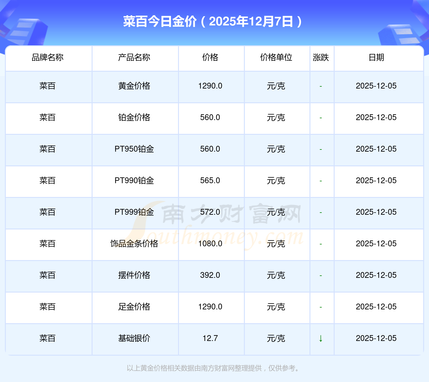 以上数据仅供参考,与当地品牌商、金店、企业及银行营业厅报价有所差异,依产品不同需另附工费,请以实际报价为准。本站对价格等不作任何保证或承诺,请自行核实相关内容,因此所引起的后果与本站无关。