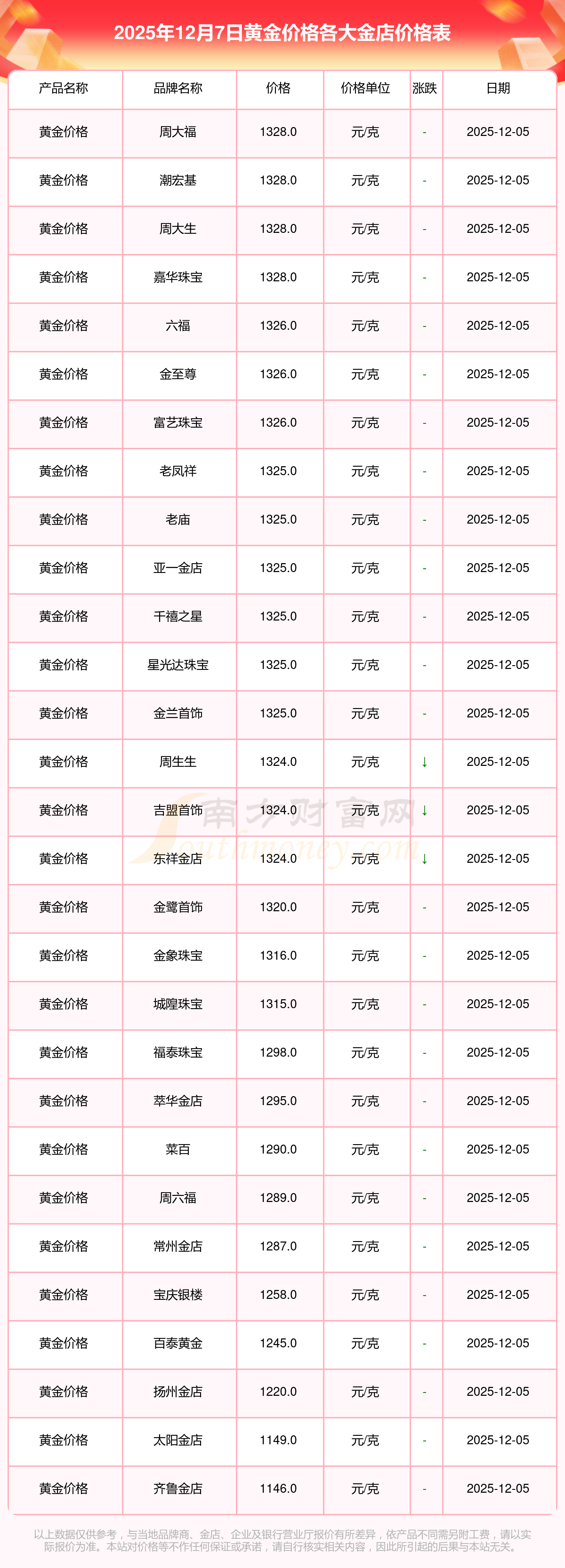 2025年12月7日各大金店黄金价格最新价格:周大福1328.0元/克,周大福662.0元/克,周大福1328.0元/克,周大福46550.0,周大福18970.0,周大福41990.0,周大福1165.0元/克,老凤祥1325.0元/克,老凤祥600.0元/克,老凤祥1325.0元/克,周六福1289.0元/克。