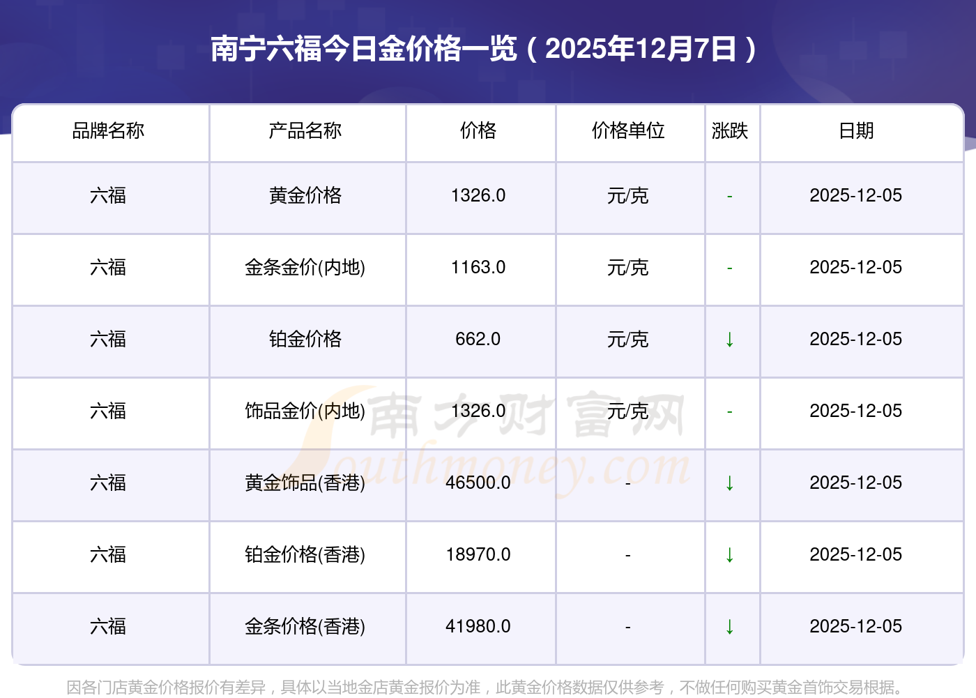 2025年12月7日南宁六福现在黄金一克要多少钱:黄金价格1328.0元/克,铂金价格662.0元/克,饰品金价(内地)1328.0元/克,黄金饰品(香港)46550.0,铂金价格(香港)18970.0,金条价格(香港)41990.0,金条金价(内地)1165.0元/克,黄金价格1325.0元/克,铂金价格600.0元/克,足金价格1325.0元/克,黄金价格1289.0元/克。