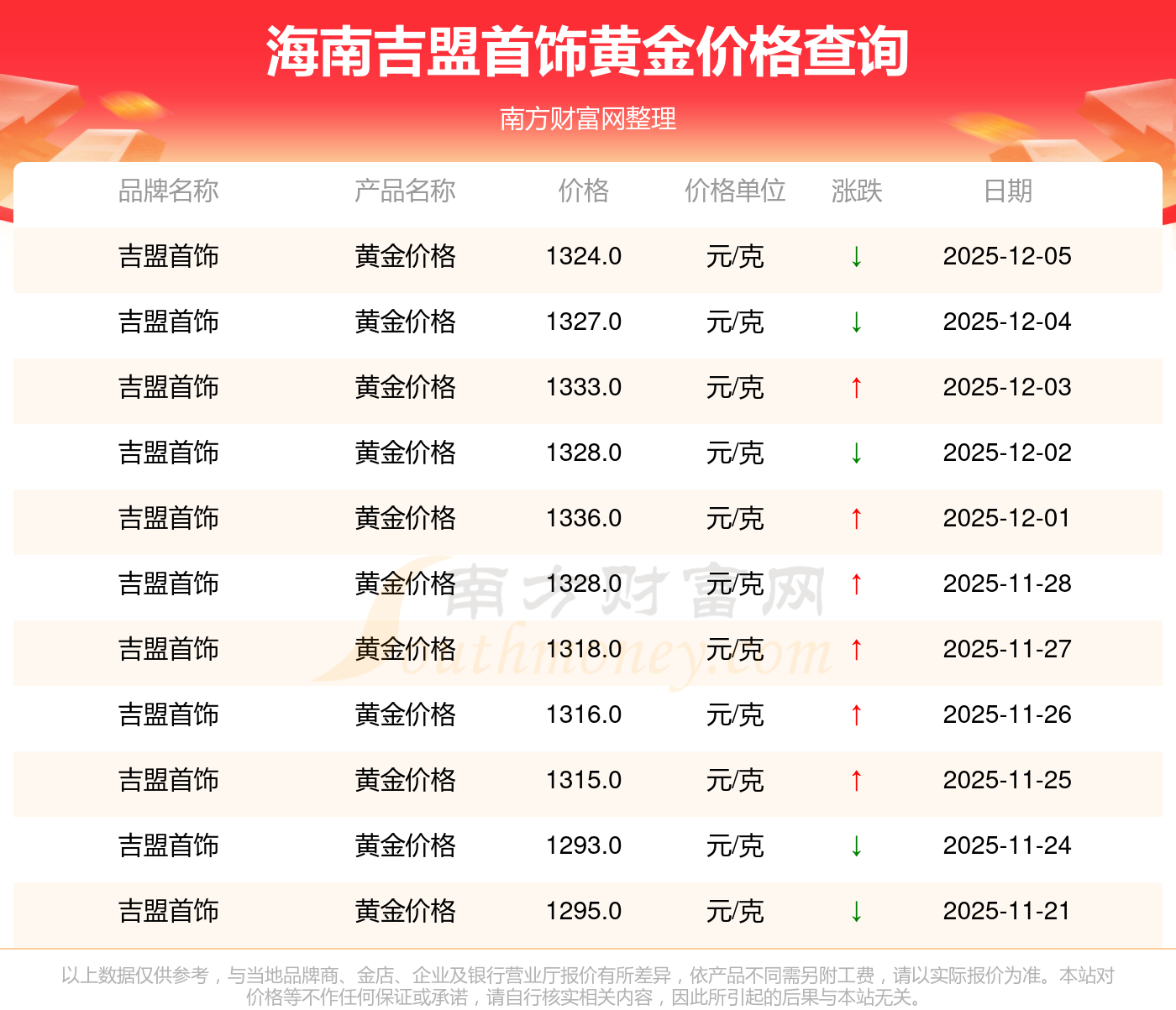 今日海南吉盟首饰黄金价格公布每克黄金在市面上的价格是怎样的于 2025年12月7日,海南吉盟首饰黄金价格的克价为1324.0元/克。