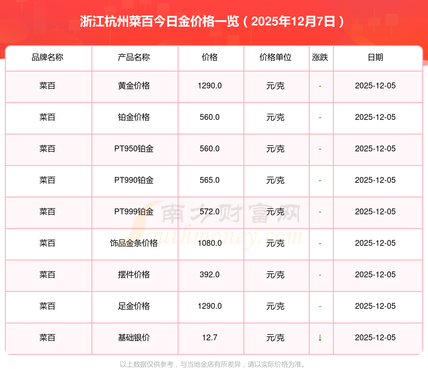 2025年12月7日浙江杭州菜百黄金的单价,一克为多少?黄金价格1328.0元/克,铂金价格662.0元/克,饰品金价(内地)1328.0元/克,黄金饰品(香港)46550.0,铂金价格(香港)18970.0,金条价格(香港)41990.0,金条金价(内地)1165.0元/克,黄金价格1325.0元/克,铂金价格600.0元/克,足金价格1325.0元/克,黄金价格1289.0元/克。