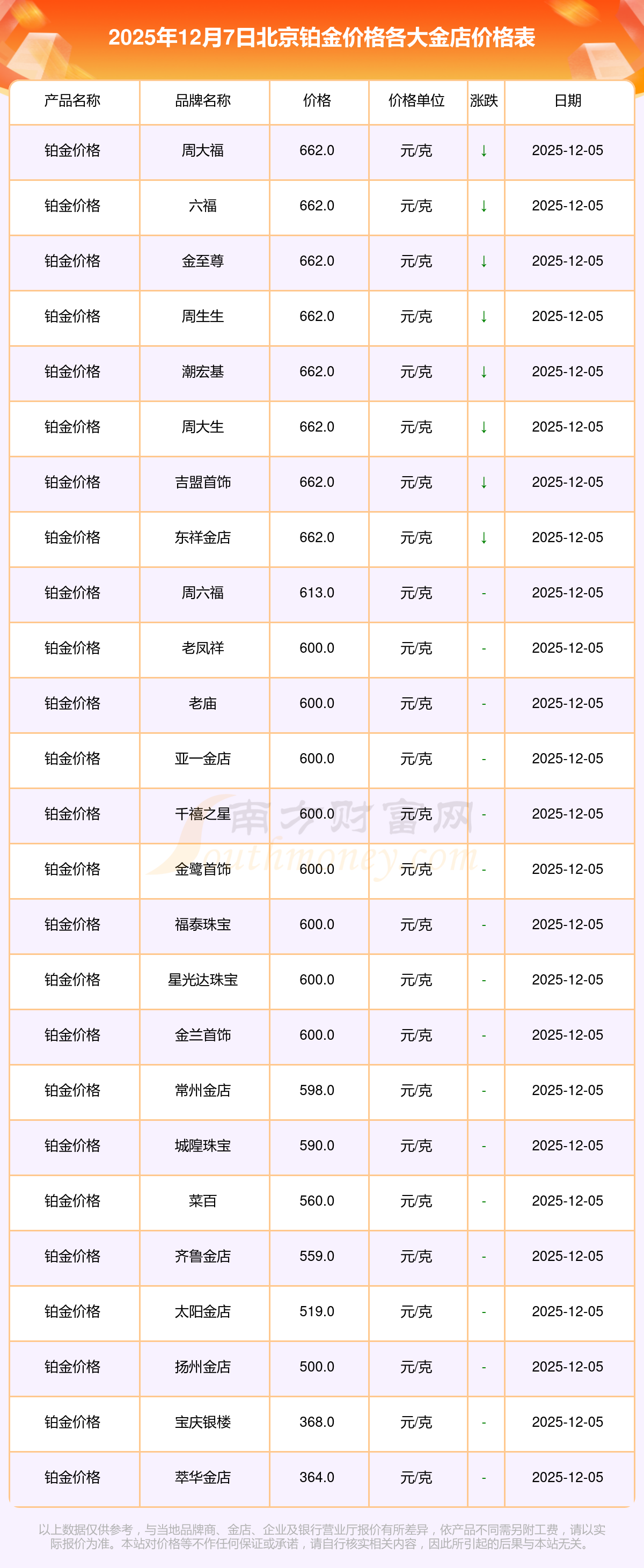 据了解,今日北京铂金价格最低的金店是萃华金店,报价364.0元/克,最高的是周大福,报价662.0元/克。今日铂金价格高低差为298元/克。