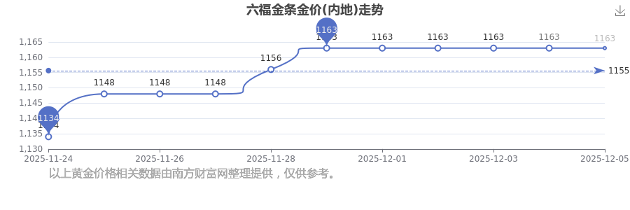 今日六福 金条金价(内地)最新的克重售价为1163.0元/克。