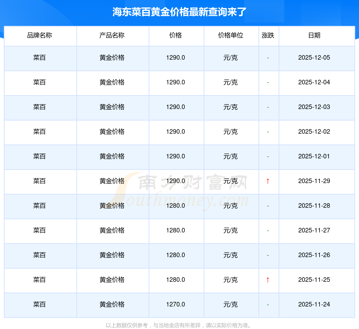 海东菜百 2025年12月7日的黄金价格价位为 1290.0元/克。