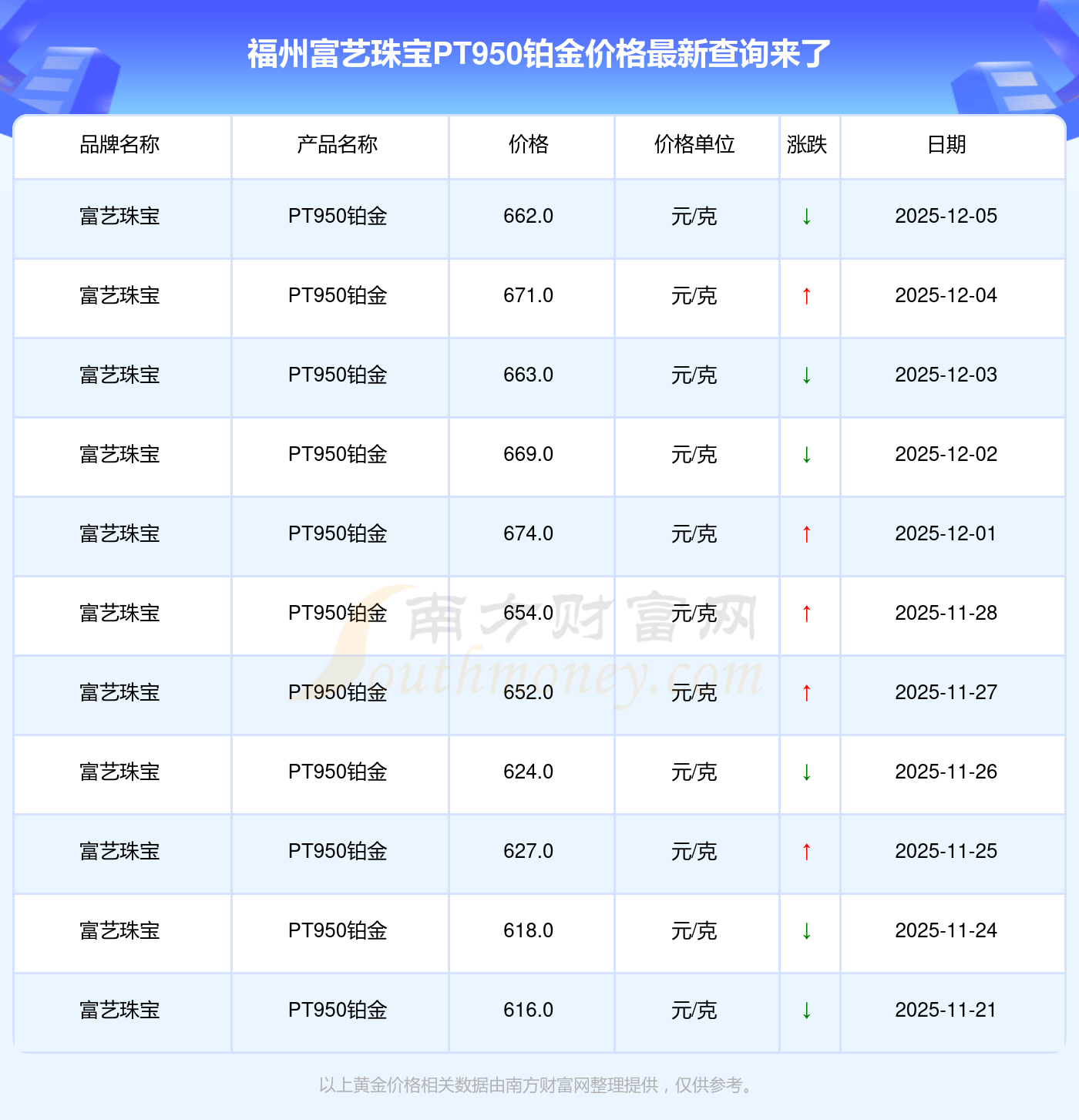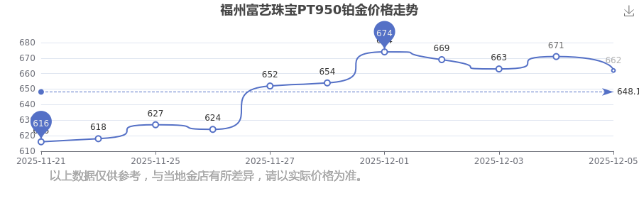 今日(2025年12月7日),福州富艺珠宝PT950铂金的定价为 662.0元/克。