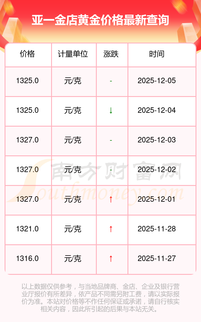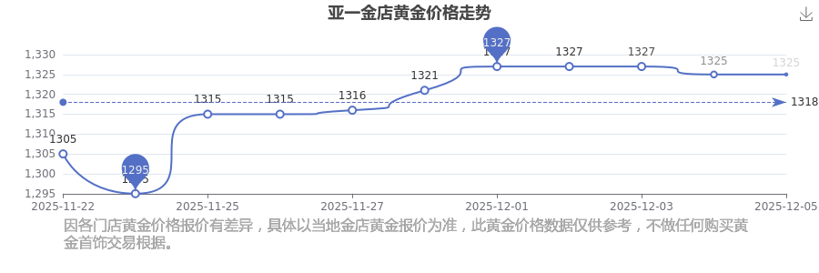 今日亚一金店 黄金价格最新的克重售价为1325.0元/克。