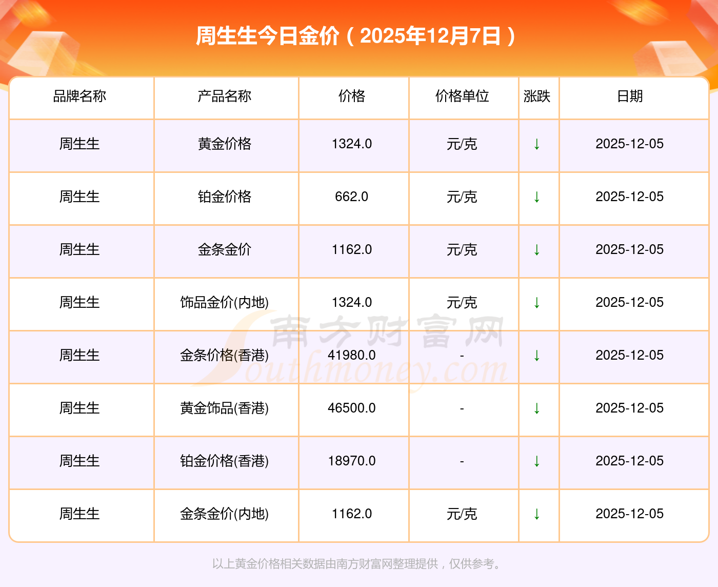 2025年12月7日周生生今日价格:黄金价格1328.0元/克,铂金价格662.0元/克,饰品金价(内地)1328.0元/克,黄金饰品(香港)46550.0,铂金价格(香港)18970.0,金条价格(香港)41990.0,金条金价(内地)1165.0元/克,黄金价格1325.0元/克,铂金价格600.0元/克,足金价格1325.0元/克,黄金价格1289.0元/克。