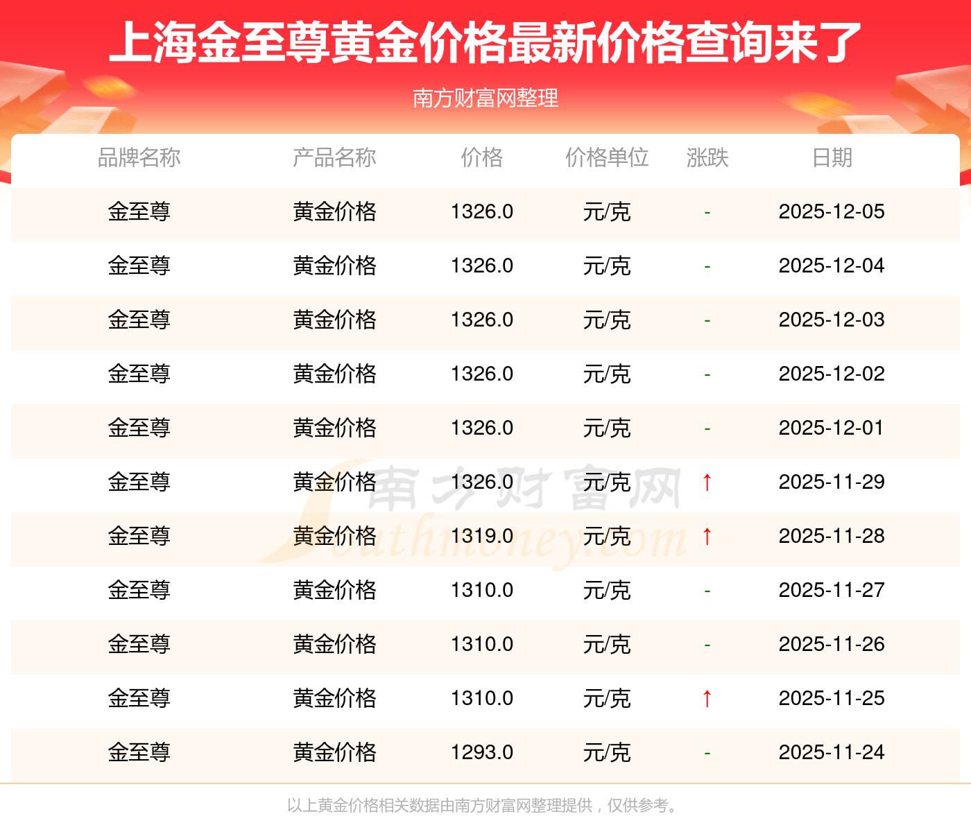 2025年12月7日各大金店黄金价格最新价格:周大福1328.0元/克,周大福662.0元/克,周大福1328.0元/克,周大福46550.0,周大福18970.0,周大福41990.0,周大福1165.0元/克,老凤祥1325.0元/克,老凤祥600.0元/克,老凤祥1325.0元/克,周六福1289.0元/克。