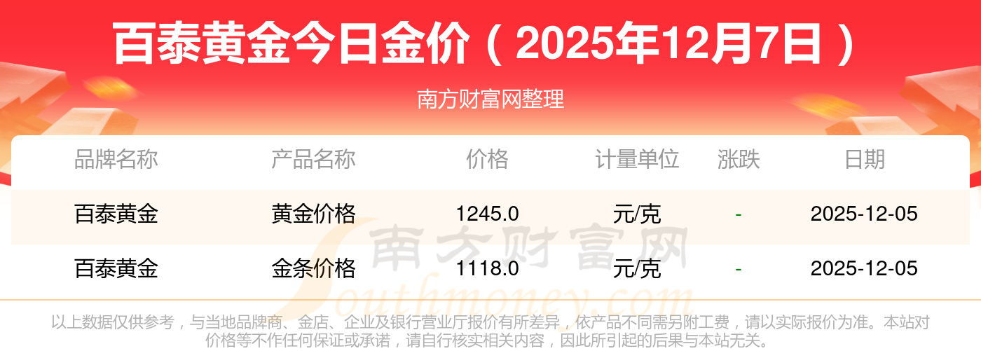 2025年12月7日百泰黄金今日价格:黄金价格1328.0元/克,铂金价格662.0元/克,饰品金价(内地)1328.0元/克,黄金饰品(香港)46550.0,铂金价格(香港)18970.0,金条价格(香港)41990.0,金条金价(内地)1165.0元/克,黄金价格1325.0元/克,铂金价格600.0元/克,足金价格1325.0元/克,黄金价格1289.0元/克。