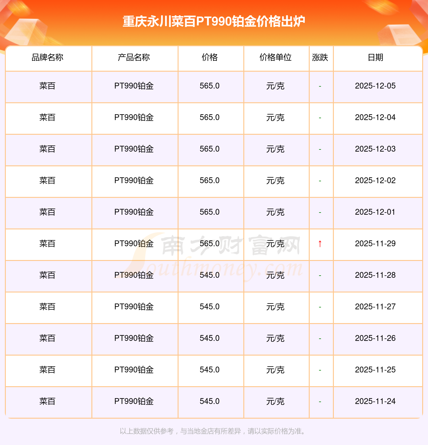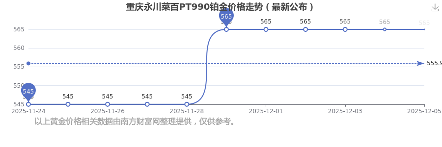 重庆永川菜百PT990铂金价格在 2025年12月7日为 565.0元/克。