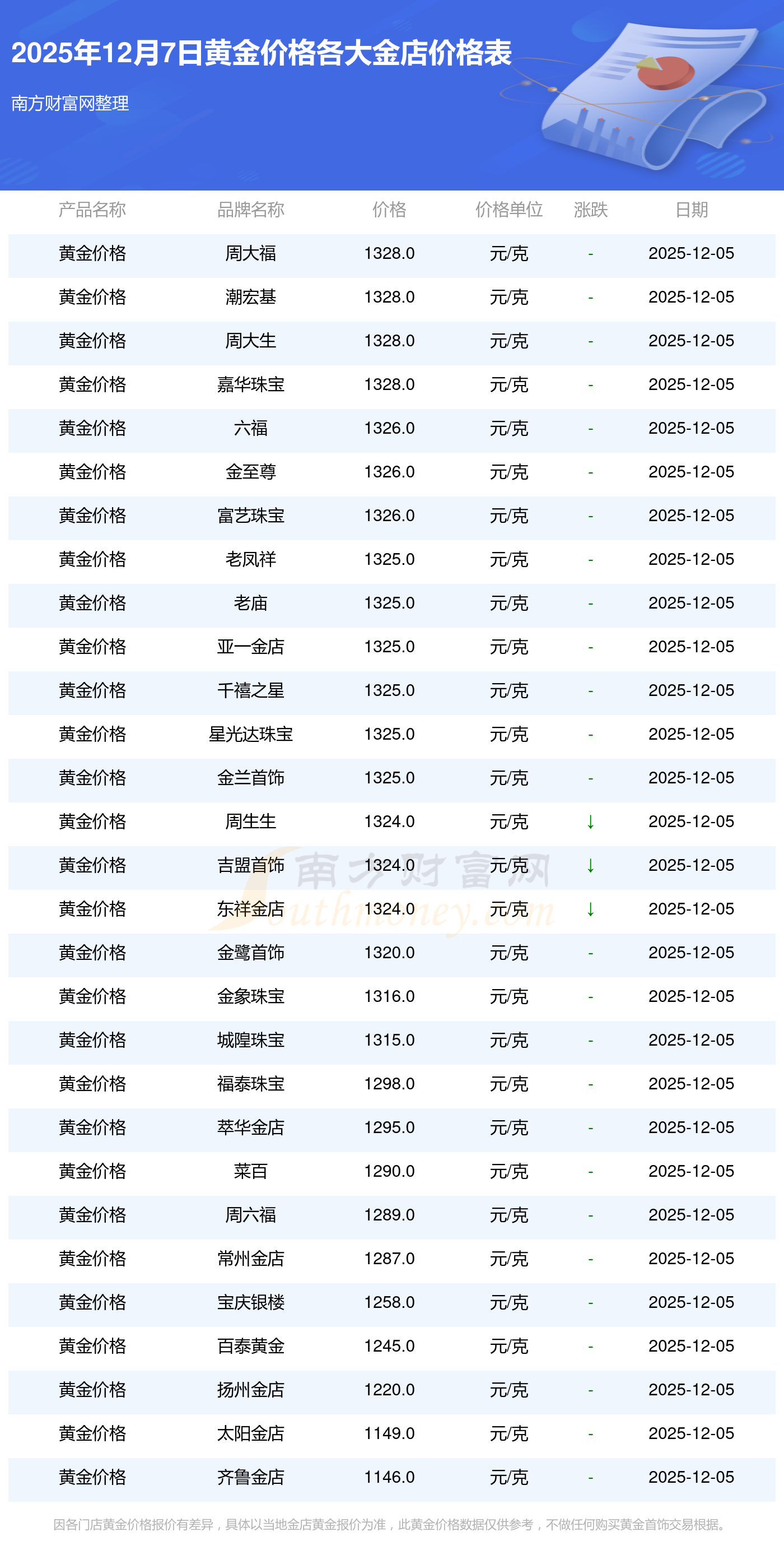 2025年12月7日周大福、周大福、周大福、周大福、周大福、周大福、周大福、老凤祥、老凤祥、老凤祥、周六福等各大金店品牌黄金价格最新价格如下:周大福黄金价格1328.0元/克,周大福铂金价格662.0元/克,周大福饰品金价(内地)1328.0元/克,周大福黄金饰品(香港)46550.0,周大福铂金价格(香港)18970.0,周大福金条价格(香港)41990.0,周大福金条金价(内地)1165.0元/克,老凤祥黄金价格1325.0元/克,老凤祥铂金价格600.0元/克,老凤祥足金价格1325.0元/克,周六福黄金价格1289.0元/克。