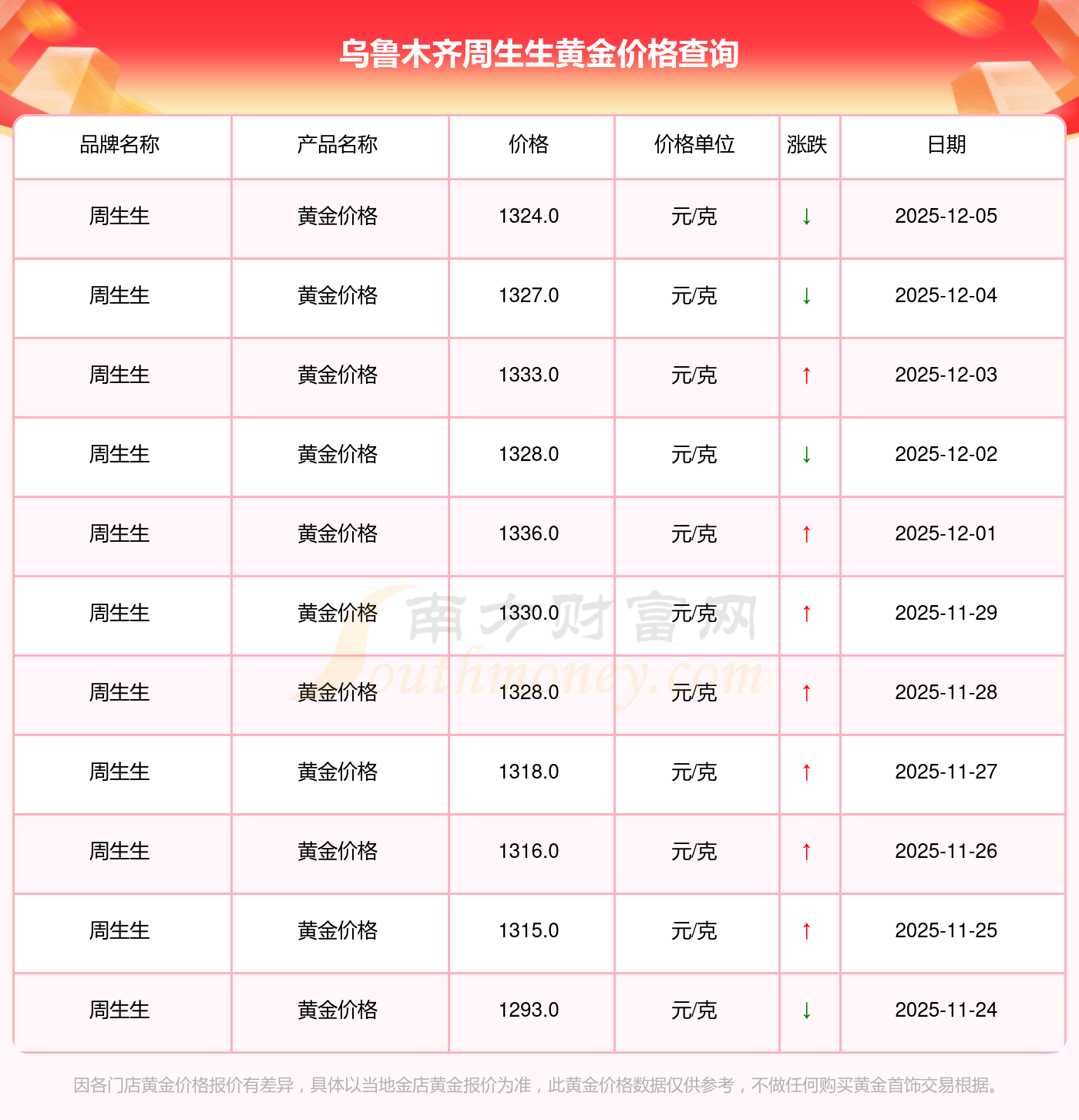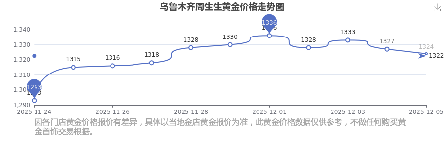 今日乌鲁木齐周生生黄金价格最新价格是1324.0元/克。