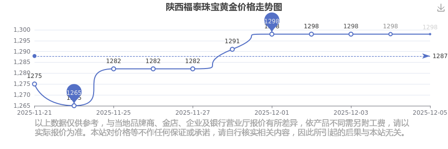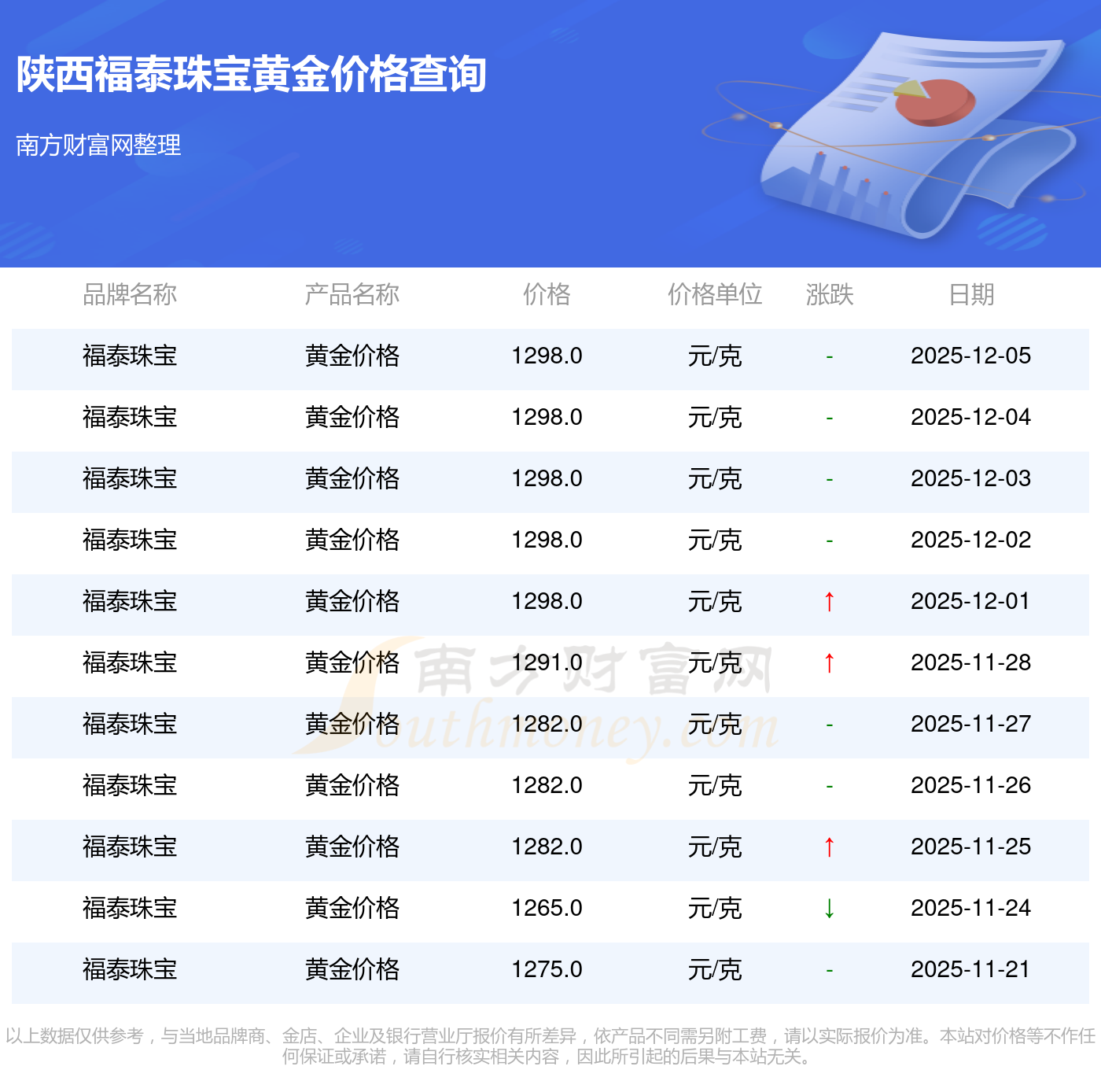 陕西福泰珠宝黄金价格现在一克多少钱?今天购买一克黄金需要多少钱?今日陕西福泰珠宝黄金价格查询,(2025年12月7日)陕西福泰珠宝黄金价格现在为1298.0元/克。
