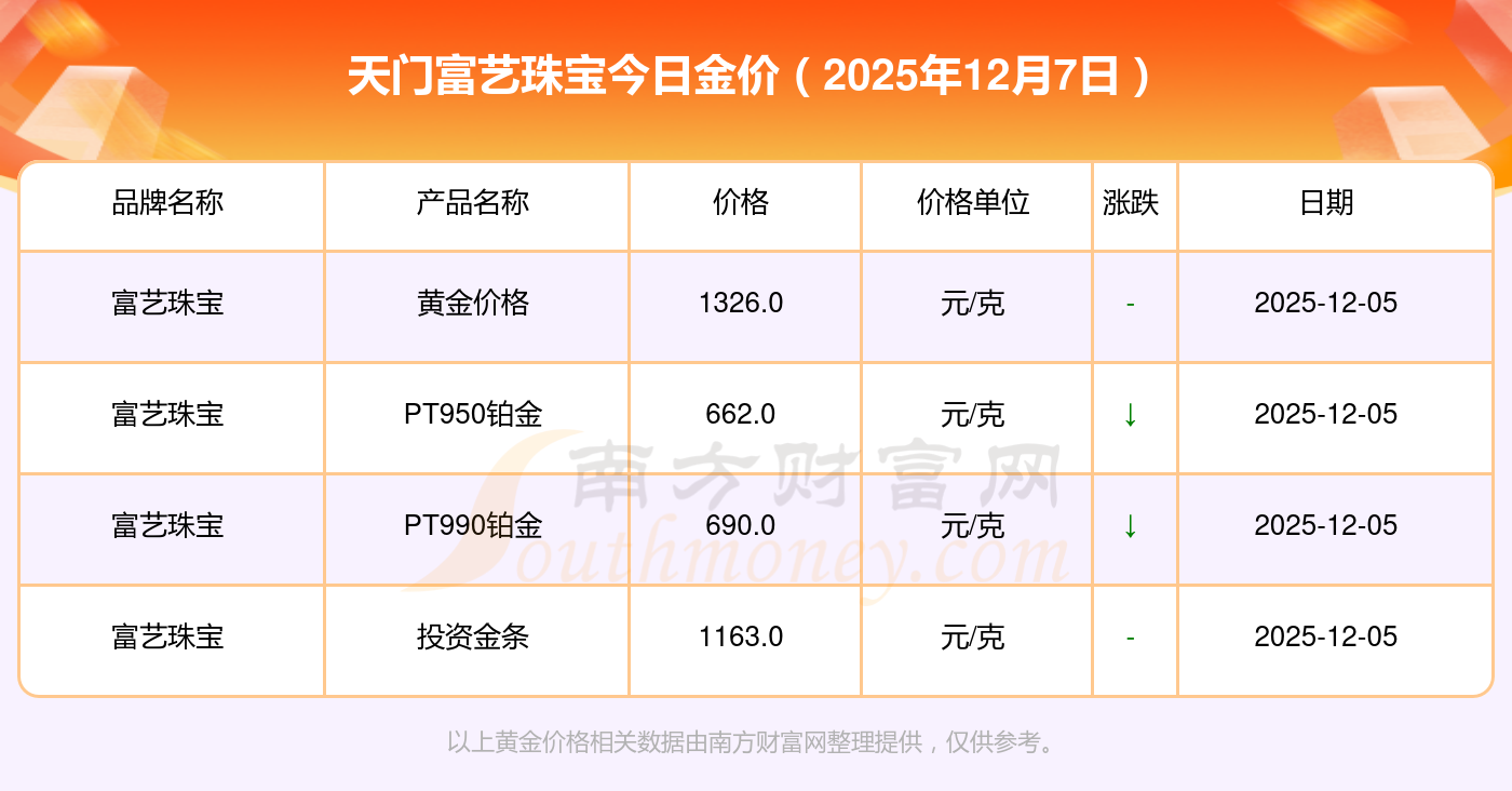 2025年12月7日天门富艺珠宝黄金一克的市场行情价是多少?黄金价格1328.0元/克,铂金价格662.0元/克,饰品金价(内地)1328.0元/克,黄金饰品(香港)46550.0,铂金价格(香港)18970.0,金条价格(香港)41990.0,金条金价(内地)1165.0元/克,黄金价格1325.0元/克,铂金价格600.0元/克,足金价格1325.0元/克,黄金价格1289.0元/克。